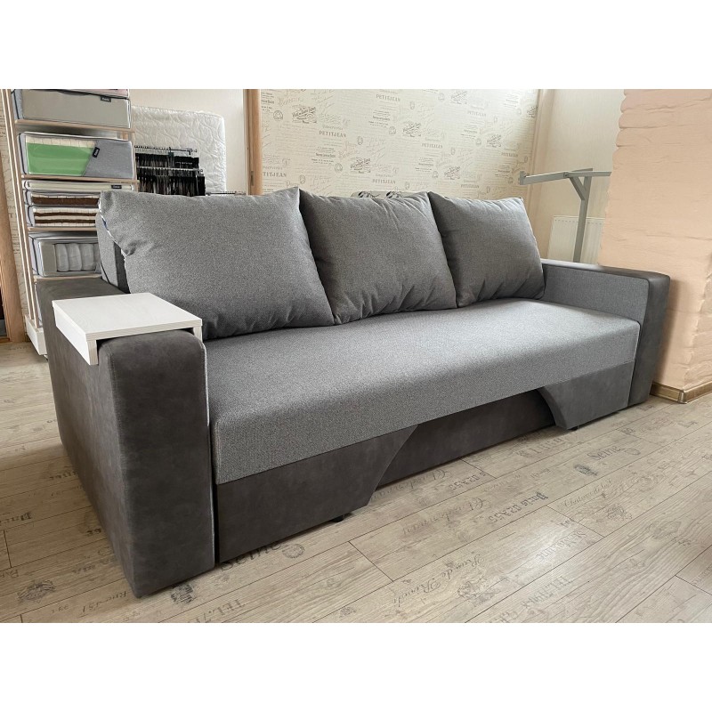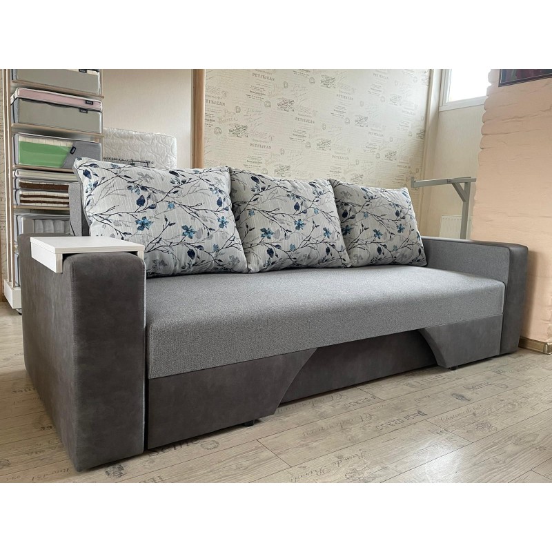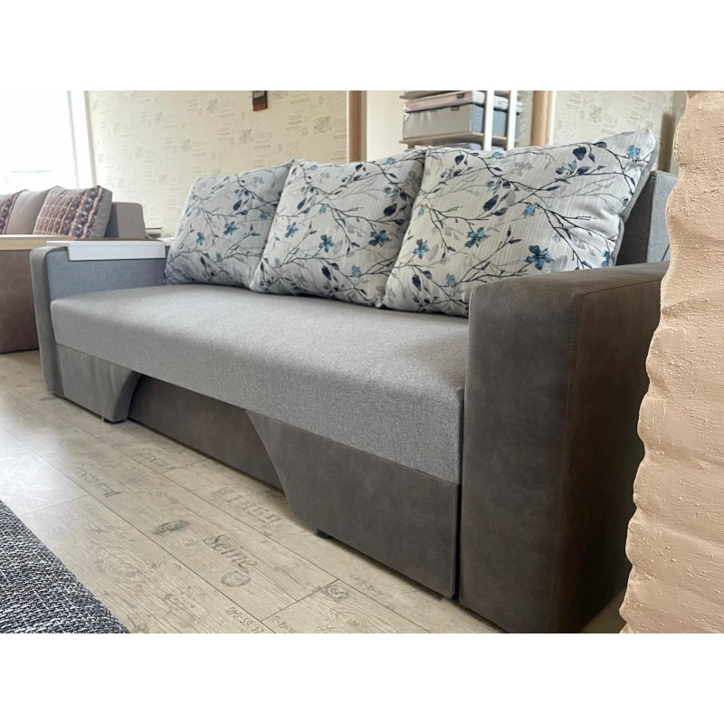 Izturīgs dīvāns, ar stingru atsperu bloku, koka rāmi un aizmugurējo sieniņu.