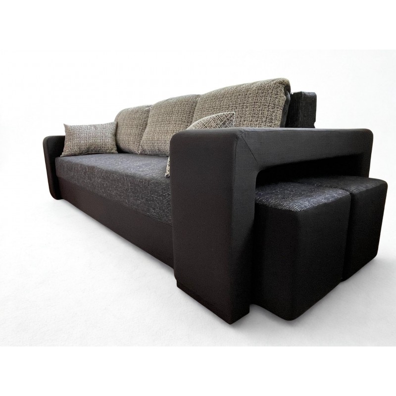 Izvelkams dīvāns ar diviem pufiem.