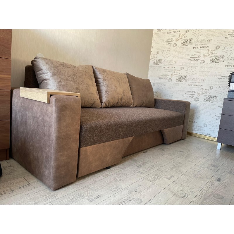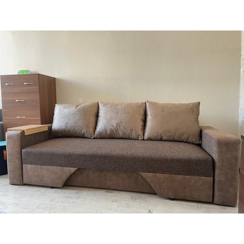 Izturīgs dīvāns, ar stingru atsperu bloku, koka rāmi un aizmugurējo sieniņu.